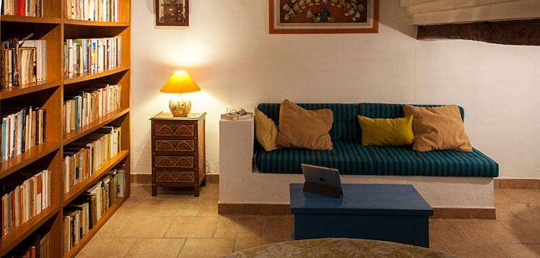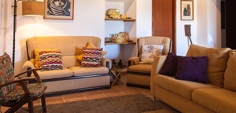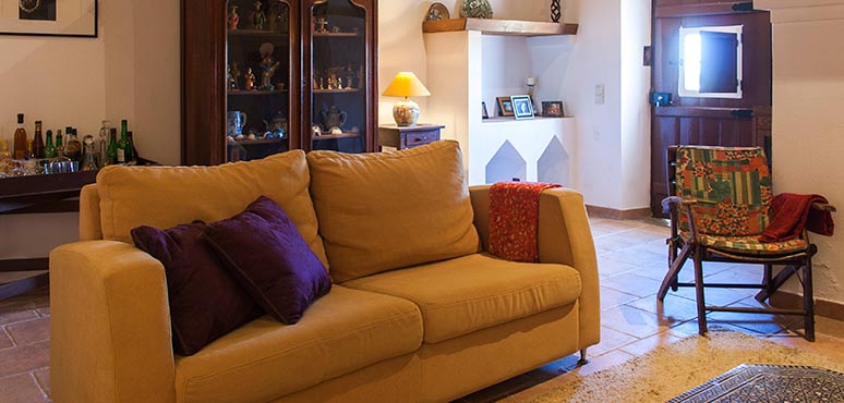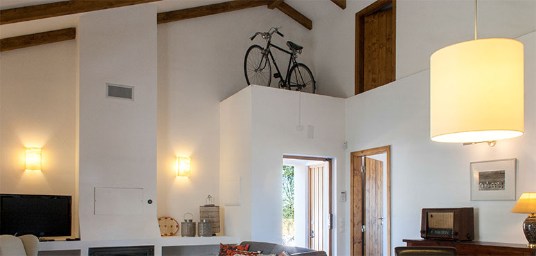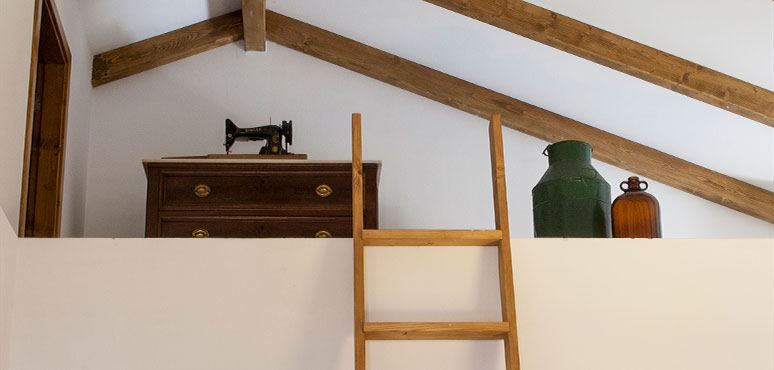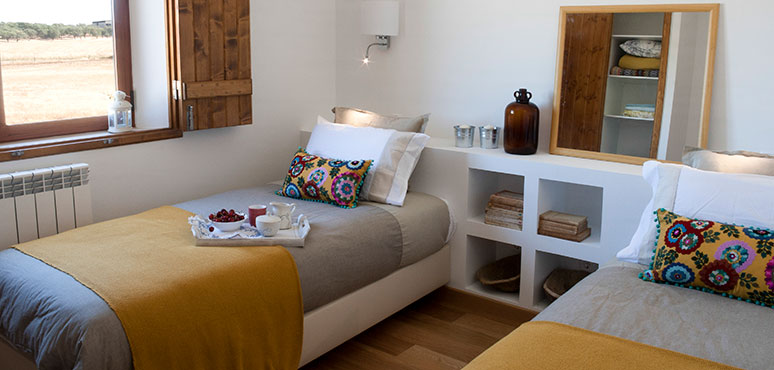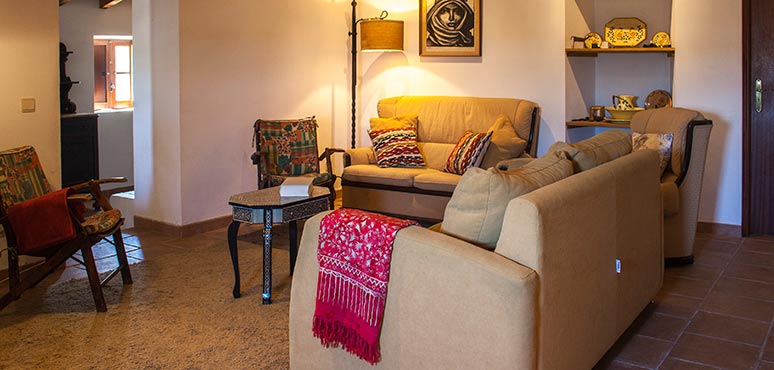 A parte reservada aos hóspedes corresponde a um quarto de casal, casa de banho, sala de estar ampla organizada em torno da lareira de chão (com sofá-cama) e cozinha que também funciona como sala de refeições.